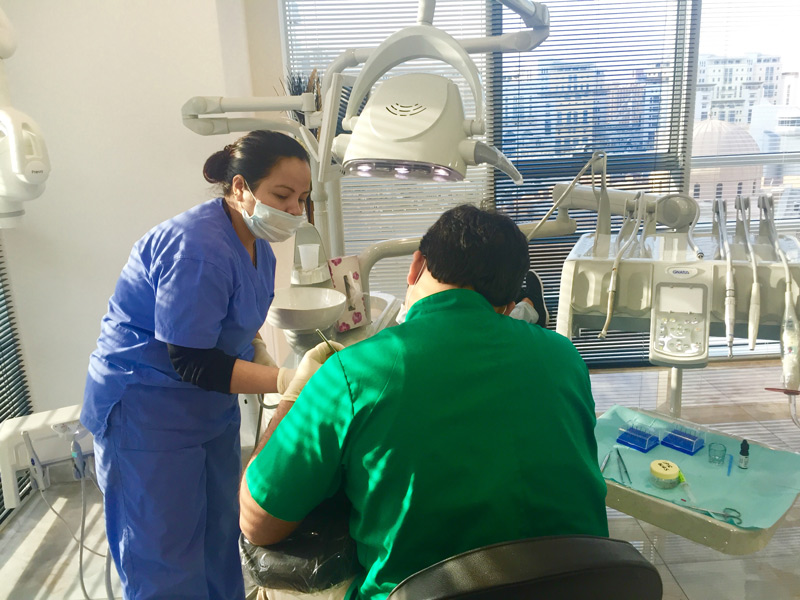 When you talk about veneers you can categorize them into 2 types. Firstly, there is the chairside veneer (also known as composite resin veneers). If a patient visits our clinic and wants to have a veneer made, and is restricted by time such as having a wedding, engagement or some type of function the following day, or happens to be a tourist here in Dubai, what we will provide is a composite veneer. We clean and polish the tooth properly, before asking the patient to choose a shade of the veneer. As a result, we can change the color and shape of the tooth and this process can be completed in only 2 to 3 hours.