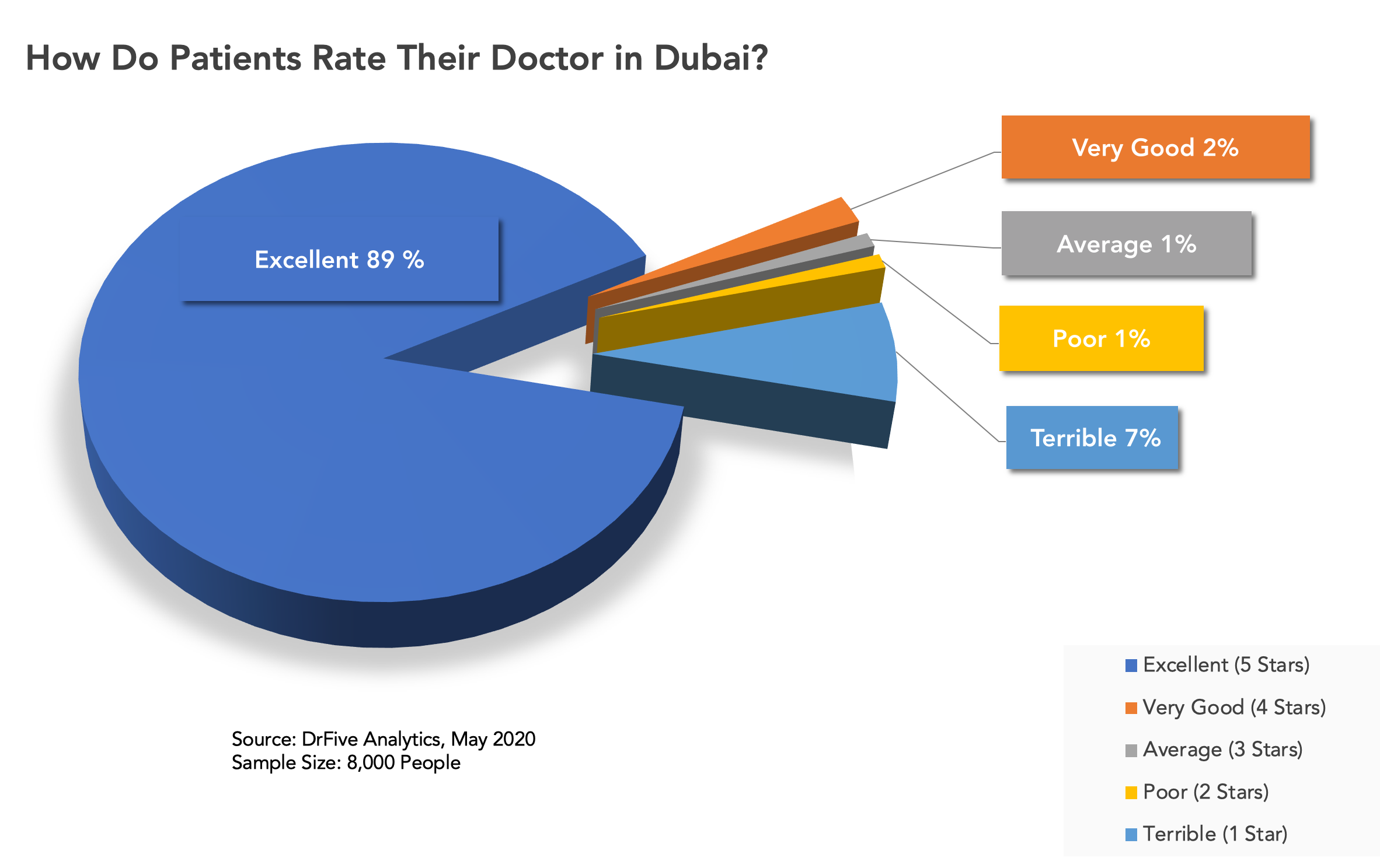Taking a sample size of 8,000 people, the numbers show that 89 percent of people rated their doctors as excellent (5 stars), 2 percent as very good (4 stars), 1 percent as average (3 stars), 1 percent as poor (2 stars) and 7 percent as terrible (1 star).